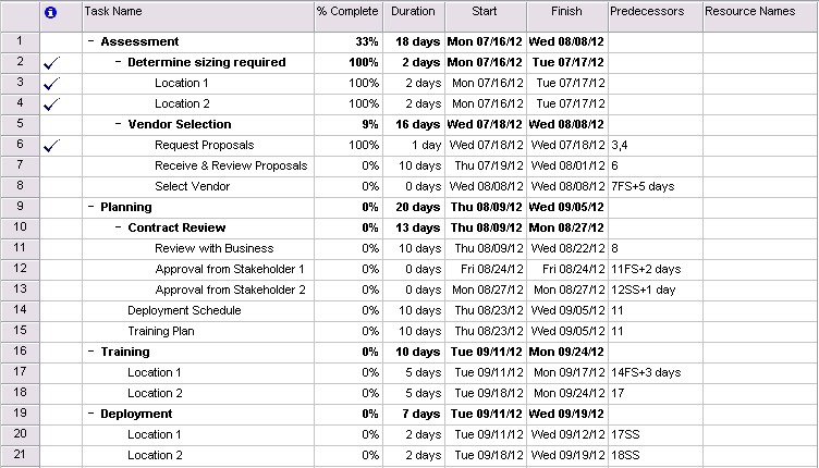 The trick is to break it down into manageable tasks, but not every individual task. You don’t need to document that you’ll send followup emails or make followup phone calls – there is such a thing as *too much* detail. On the other hand, you will find that you need to ‘tweak’ this plan every now and then to keep it realistic and properly illustrative. Here’s an example of a printer deployment plan.