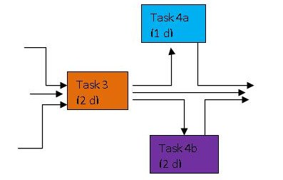 But from the above chart, you can see that there are three arrows going into and out of Task 3. Anytime you have three or more lines going to or from a single task, you have created a bottleneck. Task 3 cannot start it’s coding duties until all three of the previous tasks have completed and been delivered. Also, the rest of the team is in a ‘stop production’ mode until Task 3 is completed. This is something we need to ‘nip in the bud’ before any resources, design specifications and develop clocks are started.