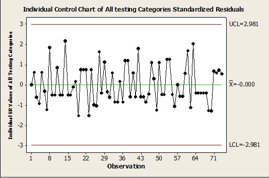 In this case we are looking at 74 instances of test evaluations.  The data follows a non-normal distribution and so we assess the predictive capability by looking at the actual defect rate based on the ± 2.0 limits. We see that there are defects on the upper side of the distribution meaning that the predictive model tends to predict 2.7 % more than what the actual score is. Further investigation into those instances of SR values > + 2 can lead to the root causes for the same.