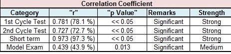 In this predictive modelling there is a causation for this effect as the student is planning and preparing for an output in score based on the controllable and procedural type inputs that they manage proactively.  The predictive scores are presented prior to the testing event to eliminate bias in the model. All PCC values indicate between a medium and strong correlation. The “p Values show their statistical significance given that they are < 0.05.